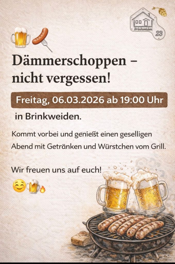 Der Förderverein hat nach der Thekeneinweihung im Februar am 25.07.25 zu einem weiteren Dämmerschoppen eingeladen, bei dem sich ca. 25 Ebbinghäuser getroffen haben. Bei frisch gezapftem Bier sowie lecker gegrillter