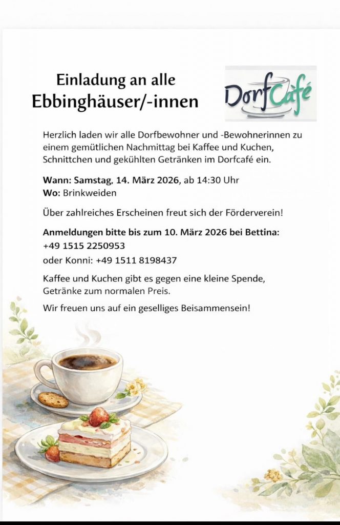 Das zweite Dorfcafé fand am 11.10.2025 statt. Zu Beginn des Nachmittages präsentierte Harald Jackisch den Ebbinghäusern die Umbaumaßnahmen, die aktuell rund um Brinkweiden stattfanden. Es wurde wieder selbstgebackener Kuchen und